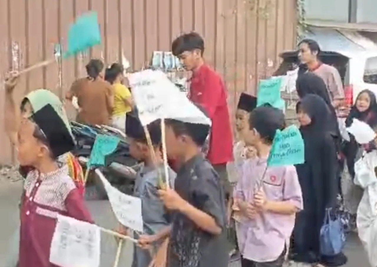 Berdasarkan pantauan di lokasi, ratusan peserta pawai yang terdiri dari anak-anak, remaja, hingga orang tua memadati badan jalan sambil membawa spanduk, bedug, serta atribut bernuansa Islami. Mereka berjalan kaki mengelilingi kawasan permukiman dan melintasi jalan utama di depan pusat perbelanjaan tersebut.